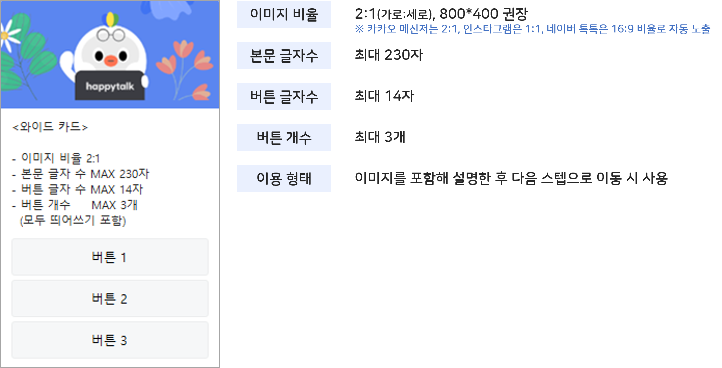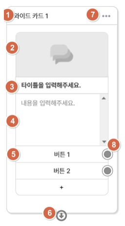 <table><thead><tr><th width="80">No</th><th width="178">구분</th><th width="71">필수</th><th>설명</th></tr></thead><tbody><tr><td>①</td><td>블럭 타이틀</td><td>X</td><td><ul><li>40자 이하 입력/수정 가능 </li><li>생성 시 “<em>와이드 카드 {No}</em>” 형태로 생성 됨</li></ul></td></tr><tr><td>②</td><td>이미지 등록</td><td>O</td><td><ul><li>800 * 400 사이즈 권장</li><li>1MB(1,000KB) 미만의 이미지 파일(JPG, PNG)만 지원</li></ul></td></tr><tr><td>③</td><td>메시지 타이틀</td><td>X</td><td><ul><li>60자 이하 입력/수정 가능</li></ul></td></tr><tr><td>④</td><td>메시지 내용 입력</td><td>X</td><td><ul><li>230자 이하 입력/수정 가능</li></ul></td></tr><tr><td>⑤</td><td>버튼</td><td>O</td><td><ul><li>최소 1개(필수) ~ 최대 3개까지만 설정 가능</li><li>50자 이하 입력/수정 가능</li><li>카카오는 최대 14자, 웹채팅 50자, 인스타 약 30자만 노출됨</li></ul></td></tr><tr><td>⑥</td><td>서브 블럭 연결 버튼</td><td>O</td><td><ul><li>해당 블럭과 연결될 블럭을 블럭 편집 창 or 마우스 Drag&#x26;Drop으로 연결 가능</li></ul></td></tr><tr><td>⑦</td><td>블럭 간략 설정 버튼</td><td>-</td><td><ul><li>클릭 시 아래 액션이 가능한 버튼 레이어 노출 <br>a. 미리보기<br>b. 복제하기 <br>c. 내용접기 <br>d. 블럭 저장 <br>e. 블럭 삭제</li></ul></td></tr><tr><td>⑧</td><td>블럭 연결 버튼</td><td>O</td><td><ul><li>버튼이 블럭 연결 버튼이거나 오픈빌더 플러그인 실행에서 다른 블럭을 연결 시도 할 때만 노출</li></ul></td></tr><tr><td>그외</td><td>블럭 적용 URL</td><td>X</td><td><ul><li>블럭에 적용될 링크 등록 가능</li></ul></td></tr></tbody></table>