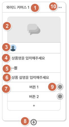 <table><thead><tr><th width="80">No</th><th width="178">구분</th><th width="71">필수</th><th>설명</th></tr></thead><tbody><tr><td>①</td><td>블럭 타이틀</td><td>X</td><td><ul><li>40자 이하 입력/수정 가능 </li><li>생성 시 “<em>와이드 커머스 카드 {No}</em>” 형태로 생성 됨</li></ul></td></tr><tr><td>②</td><td>이미지 등록</td><td>O</td><td><ul><li>800 * 400 사이즈 권장</li><li>1MB(1,000KB) 미만의 이미지 파일(JPG, PNG)만 지원</li></ul></td></tr><tr><td>③</td><td>프로필 이미지</td><td>X</td><td><ul><li>300 * 300 사이즈 권장</li><li>프로필명은 80자 이하로만 입력/수정 가능</li><li>프로필 영역 클릭 시 연결될 URL 입력하여 연결 가능</li></ul></td></tr><tr><td>④</td><td>상품명</td><td>X</td><td><ul><li>30자 이하 입력/수정 가능</li></ul></td></tr><tr><td>⑤</td><td>가격설정</td><td>O</td><td><ul><li>1원 ~ 9,999,999원 가격 입력만 가능</li><li>할인가 적용 희망시, 할인적용 ON하여 할인 가격(or 할인율) 입력 가능하며 할인가 입력 시 실판매가 금액이 노출됨</li></ul></td></tr><tr><td>⑥</td><td>상품 설명</td><td>X</td><td><ul><li>80자 이하 입력/수정 가능</li></ul></td></tr><tr><td>⑦</td><td>버튼</td><td>O</td><td><ul><li>최소 1개(필수) ~ 최대 3개까지만 설정 가능</li><li>50자 이하 입력/수정 가능</li><li>카카오는 최대 14자, 웹채팅 50자, 인스타 약 30자만 노출됨</li></ul></td></tr><tr><td>⑧</td><td>서브 블럭 연결 버튼</td><td>O</td><td><ul><li>해당 블럭과 연결될 블럭을 블럭 편집 창 or 마우스 Drag&#x26;Drop으로 연결 가능</li></ul></td></tr><tr><td>⑨</td><td>블럭 연결 버튼</td><td>O</td><td><ul><li>버튼이 블럭 연결 버튼이거나 오픈빌더 플러그인 실행에서 다른 블럭을 연결 시도 할 때만 노출</li></ul></td></tr><tr><td>⑩</td><td>블럭 간략 설정 버튼</td><td>-</td><td><ul><li>클릭 시 아래 액션이 가능한 버튼 레이어 노출 <br>a. 미리보기 <br>b. 복제하기 <br>c. 내용접기 <br>d. 블럭 저장 <br>e. 블럭 삭제</li></ul></td></tr><tr><td>그외</td><td>블럭 적용 URL</td><td>X</td><td><ul><li>블럭에 적용될 링크 등록 가능</li></ul></td></tr></tbody></table>